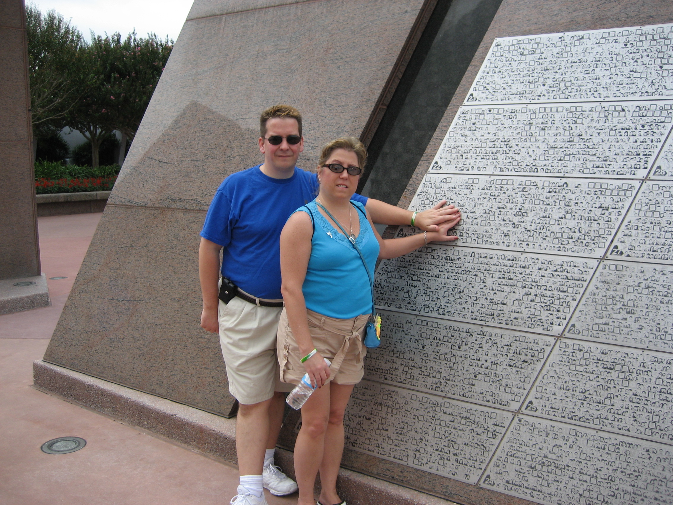 Kris and I pointing to the memorial tile for our daughter Vicki
