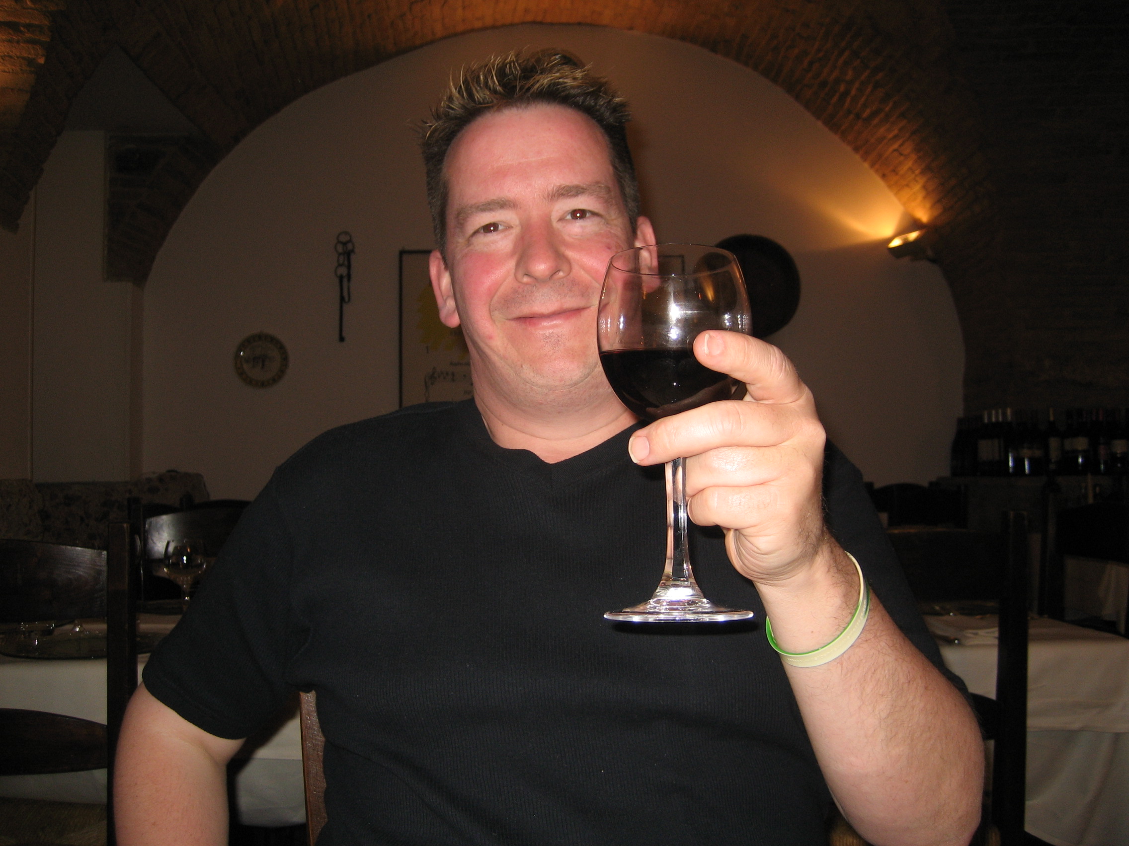Enjoying a fine glass of Sangiovese at Ristorante Medioevo in Assisi, Italy.